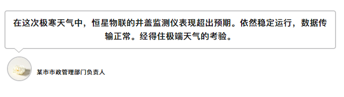 当城市被冰雪覆盖,当气温跌破零度,您的井盖监测设备是否还能正常工作?恒星物联最新推出的井盖状态监测——即使在-20℃的严寒环境下,设备依然稳定运行,数据传输正常,为城市管理者提供了可靠的安全保障。